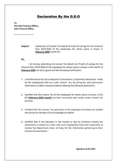 మీరు తప్పక ఎంప్లాయిస్ ఇన్కమ్ టాక్స్ ఫామ్స్ తో పాటీ క్రింద ఇవ్వబడిన డిడిఓ డిక్లరేషన్ ఫామ్ తప్పక ఇంట్లో చేయవలెను. ఒకవేళ మీరు డిడిఓ డిక్లరేషన్ లెటర్ మరిచిన యెడల ట్రెజరీ వారు బిల్ ను రిజెక్ట్ చేసే అవకాశం ఉన్నది.